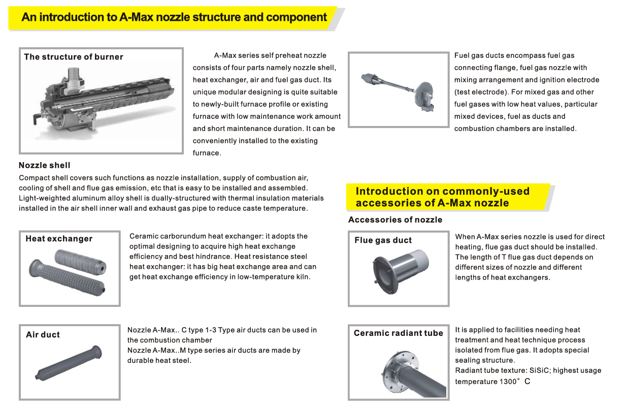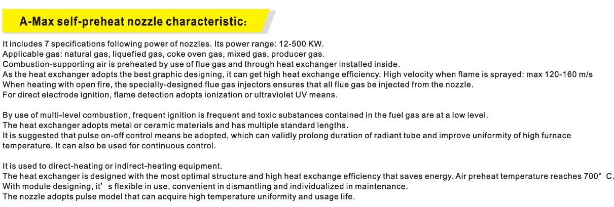Self preheat nozzles are usually used in energy-conservative direct heating system by combing with smoke ejector and exhaustcasing, itis orimarily applied to steel, nonferrous industry and other industrial furnace and combustion svstems such as indoorsfurnace, trolley furnace, bell-tvpe furnace, rotary hearth furnace and ceramic roller kiln, etc