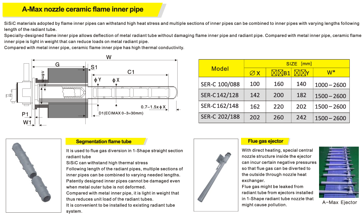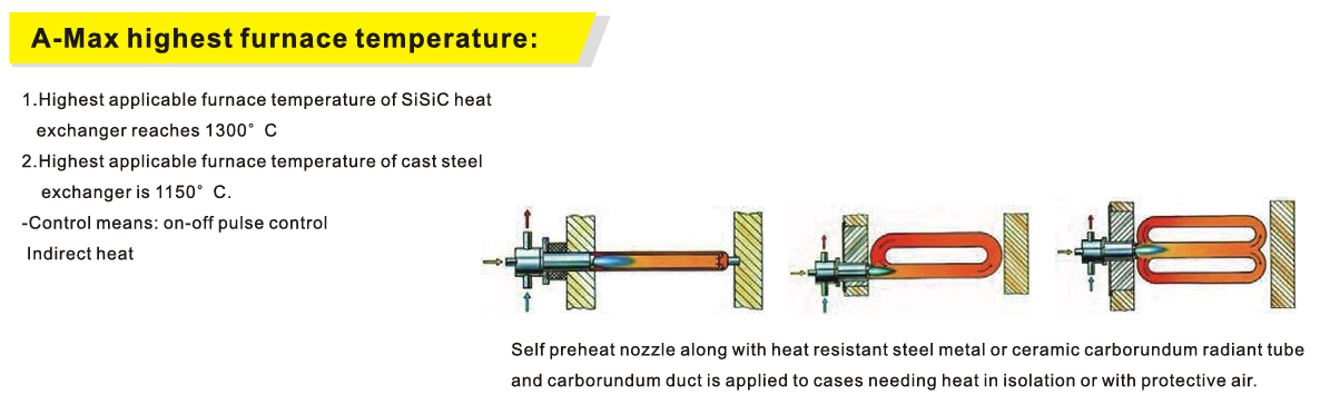 Self preheat nozzle that goes with heat resistance steel, carborundum radiant tube and carborundum duct is applied to productsneeding isolated heating or heating with protective atmosphere such as non-oxidation roller hearth furnace, protective atmospheremesh furnace and continuous annealing line, etc. When it is applied to radiant tube indirect heating system, common types of radianttubes cover Type P and Type W.