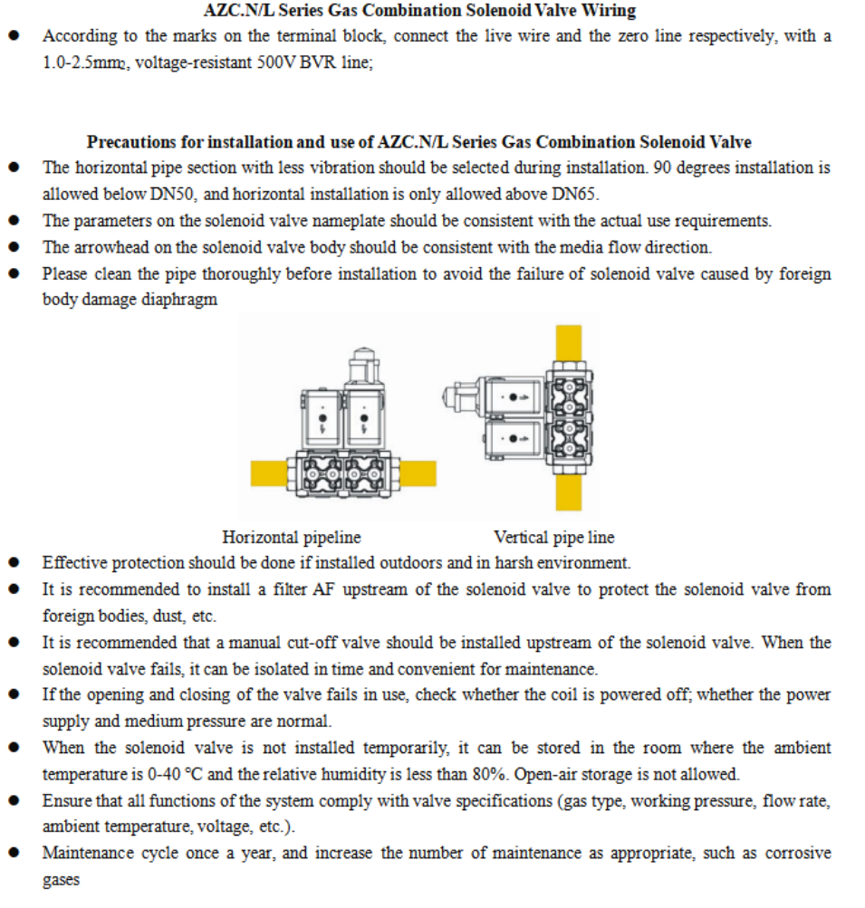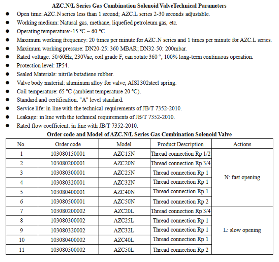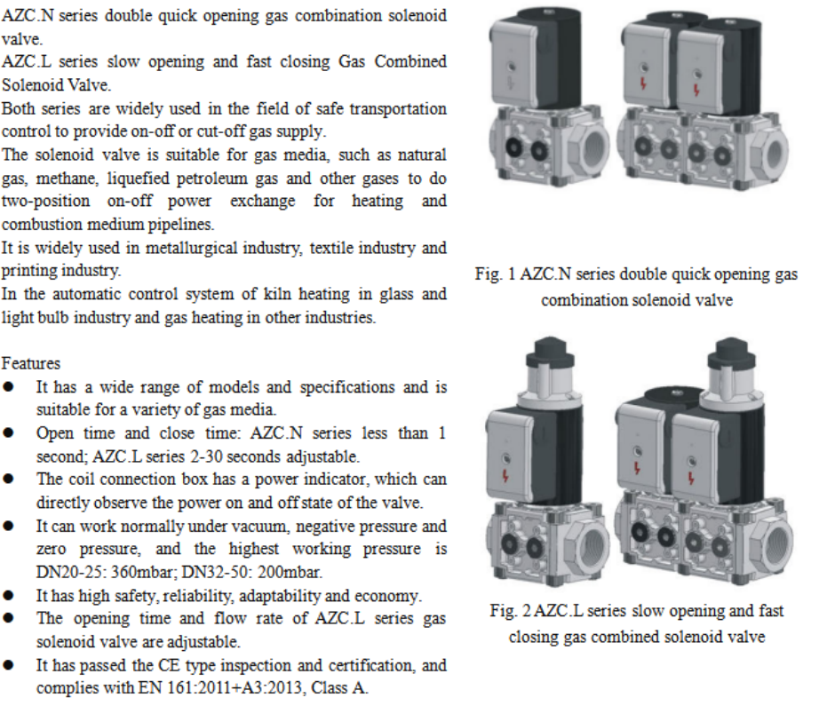 AZC series gas combimation solenoid valve is a safety equipment suitable for cutting offgas circuit.AZC N/L series gas combination solenoid valves have reliable working characteristics, so they are usuallyinstalled in gas pipelines as equipment for safety and gas flow regulation.The AZC.N/L series gas combination solenoid valve is usually closed, and the power is tumed on quickly. Theblue light is on after the power is turmed on, and the light is turmed off immediately after the power is cut offThere are by-pass holes on both sides of the valve body, and the aperture is G1/4"The AZC.L series gas combination solenoid valve is usually closed, and the mode state set by the factory canbe re-adjusted in the power-on state for the first time, the opening time and the back-end output flow can beadjusted, and the fast or slow opening section within the open stroke range can be adjusted.