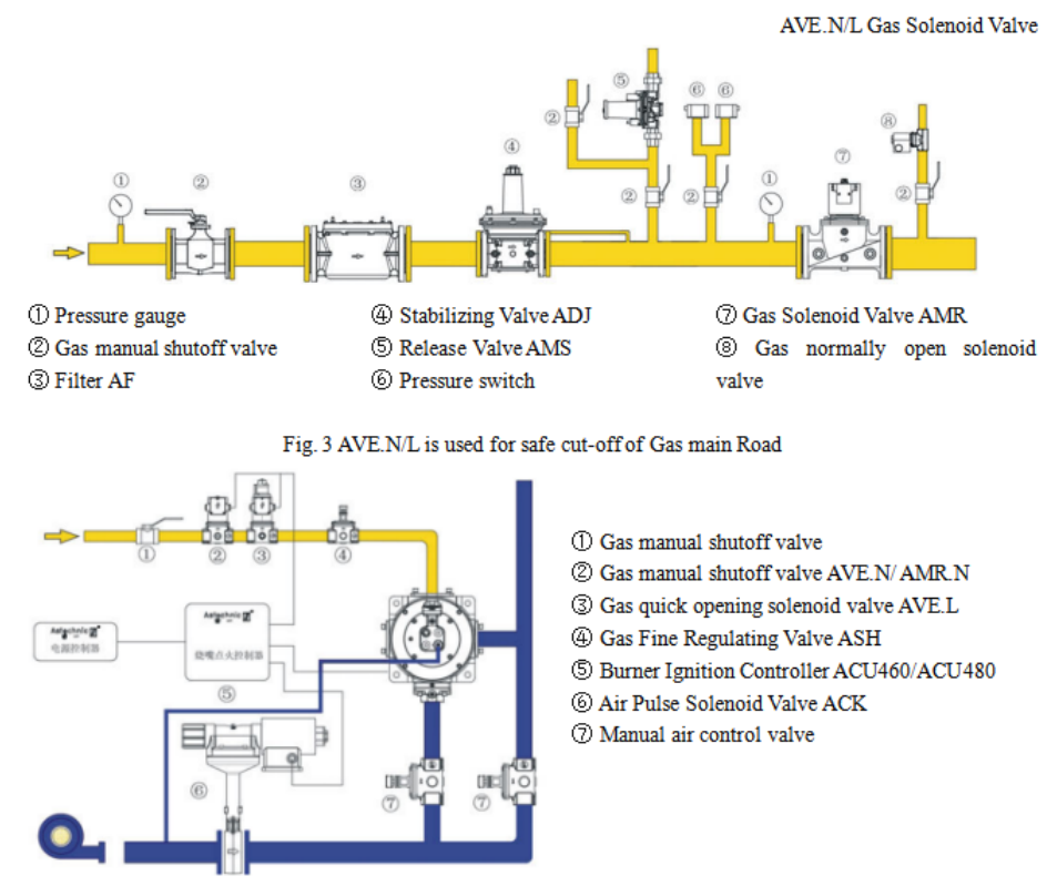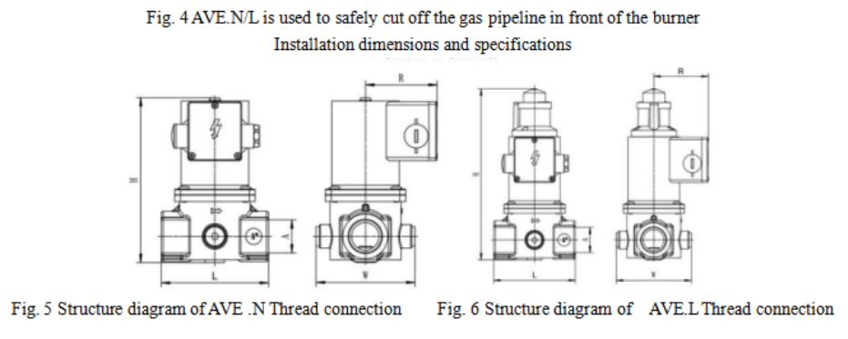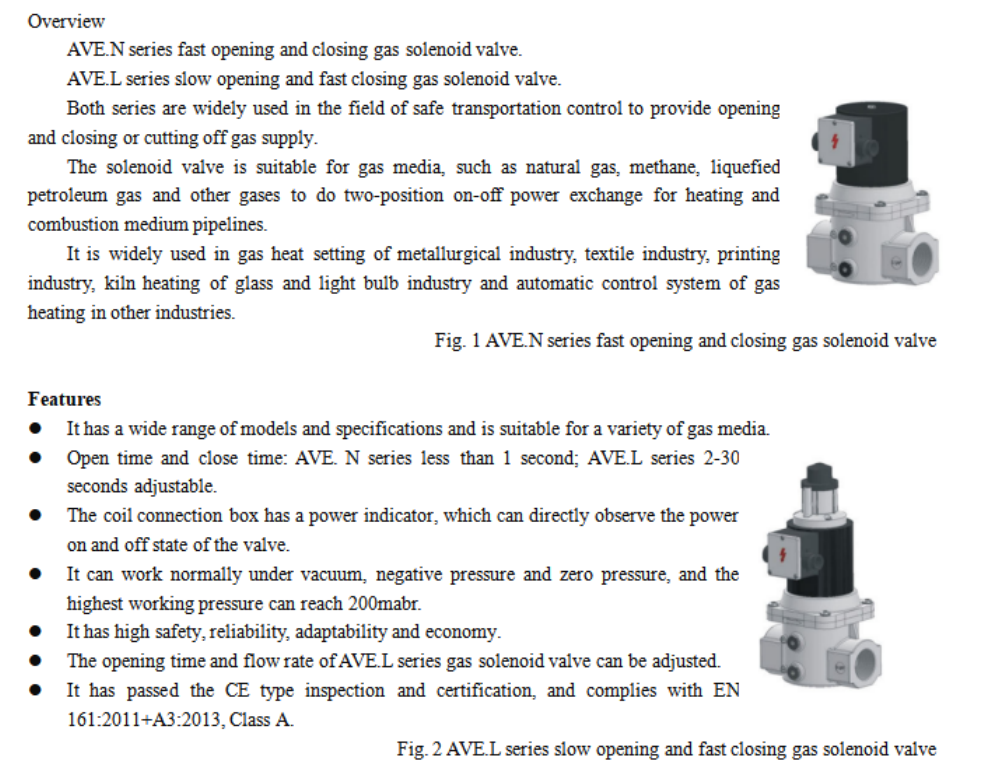Functions and ApplicationsAVE series gas solenoid valve is a safety equipment suitable for cutting off gas circuit.AVE.N/L series gas solenoid valves have reliable working characteristics, so they are usually installed in gaspipelines as equipment for safety and gas flow regulation.AVE.N/L series gas solenoid valve is often closed, the power on quickly opens, the green light is on after thepower is turmed off, the light is turmed off immediately after the power is cut off. There are by-pass holes onboth sides of the valve body, and the aperture is G1/4 ".AVE.L series gas solenoid valves are usually closed, and the mode state set by the factory can be re-adjusted inthe power-on state for the first time, the opening time and the output flow of the back end can be adiusted. andthe fast or slow opening section within the range of opening stroke can be adjusted.