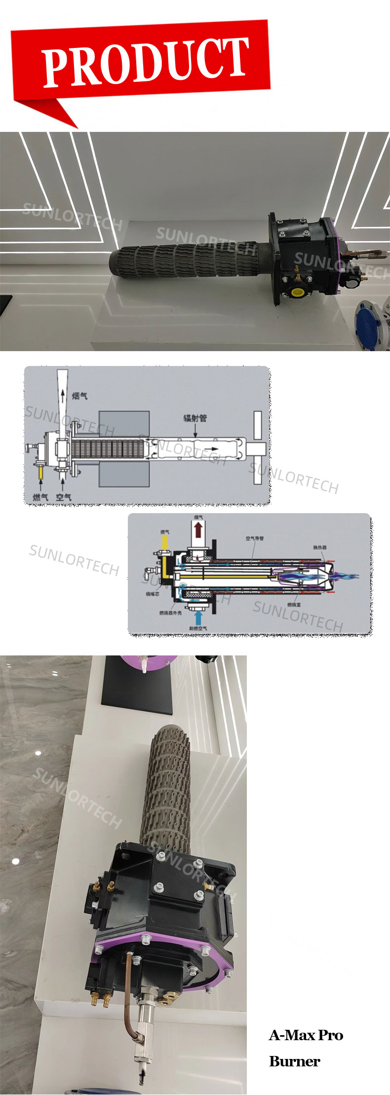 A-MAX is an efficient and energy saving combustion equipment, widely used in industrial heating field. Its core feature is the use of waste heat of flue gas to preheating air, so as to significantly improve the thermal efficiency and reduce fuel consumption. A-MAX's own preheating burner uses the heat exchanger to heat the flue gas for combustion air.combustion wind into the burner, in the shell of the interlayer, there is a small amount of combustion air into the air tube in the combustion chamber inside the combustion, the rest of the combustion air through the air duct and heat exchanger cracks to the heat exchanger head and the external chamber space again into two strands, a reflux to a combustion chamber, a one from the combustion head and the gap of the heat exchanger cap high speed to participate in the second combustion. Graded combustion and high-speed combustion mean less pollutant production.